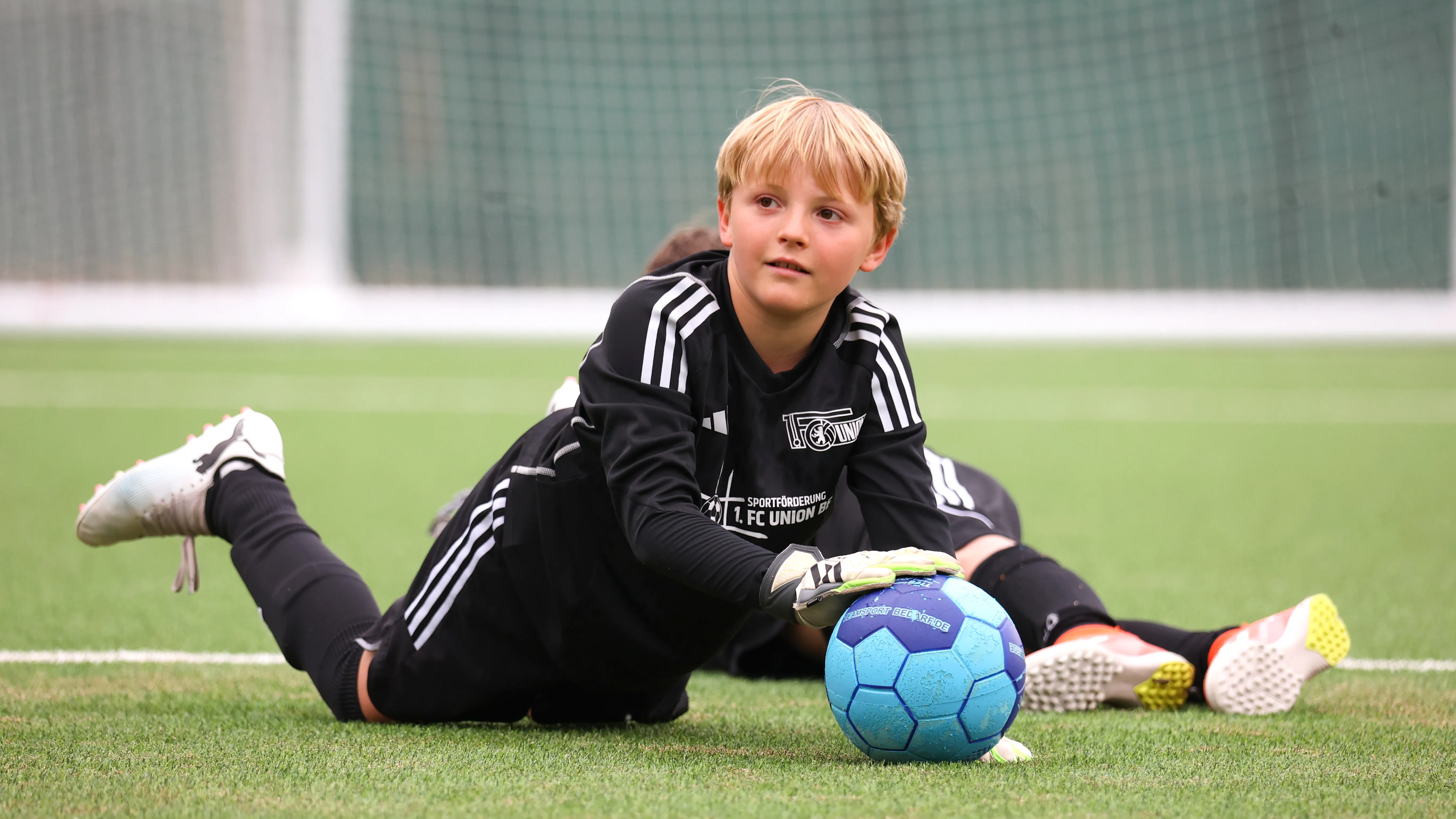 Ein Junge in schwarzer Fußballausrüstung liegt auf dem Rasen und hält einen blauen Ball, während ein weiterer Spieler im Hintergrund zu sehen ist.