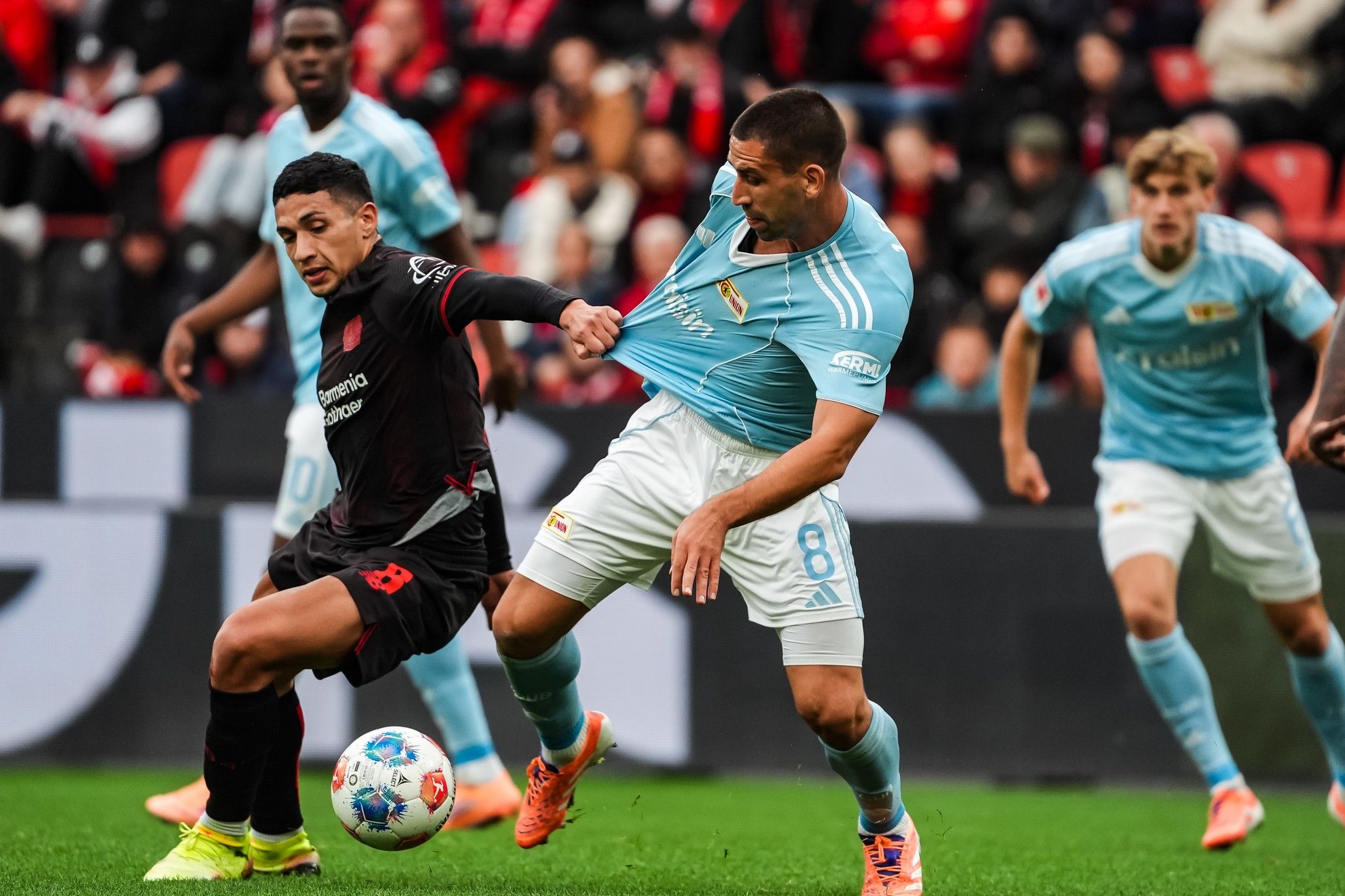 Erwartungsgemäß übernahmen die Hausherren von Bayer 04 im leichten Leverkusener Herbstregen von Beginn an die Spielkontrolle, scheiterten aber immer wieder am kompakten Abwehrriegel der Eisernen oder deren situativem Pressing. Nach zehn absolvierten Spielminuten führte ein Geistesblitz von Frederik Rönnow dann zur ersten Torchance der Partie: Seinen schnellen und präzisen Abschlag verlängerte Oliver Burke in der gegnerischen Hälfte auf Andrej Ilic, der wiederum setzte Wooyeong Jeong in Szene. Allein vor dem Bayer-Tor schloss der Südkoreaner aus 18 Metern ab, scheiterte mit diesem Versuch aber an Mark Flekken. Während sich am Ablauf auf dem Grün in der Folge nicht viel änderte, verbuchten die Berliner in der 17. Minute die nächste Möglichkeit. Nach einem Trimmel-Eckball setzte Danilho Doekhi einen im Gewühl entstandenen Abschluss knapp am linken Pfosten vorbei.