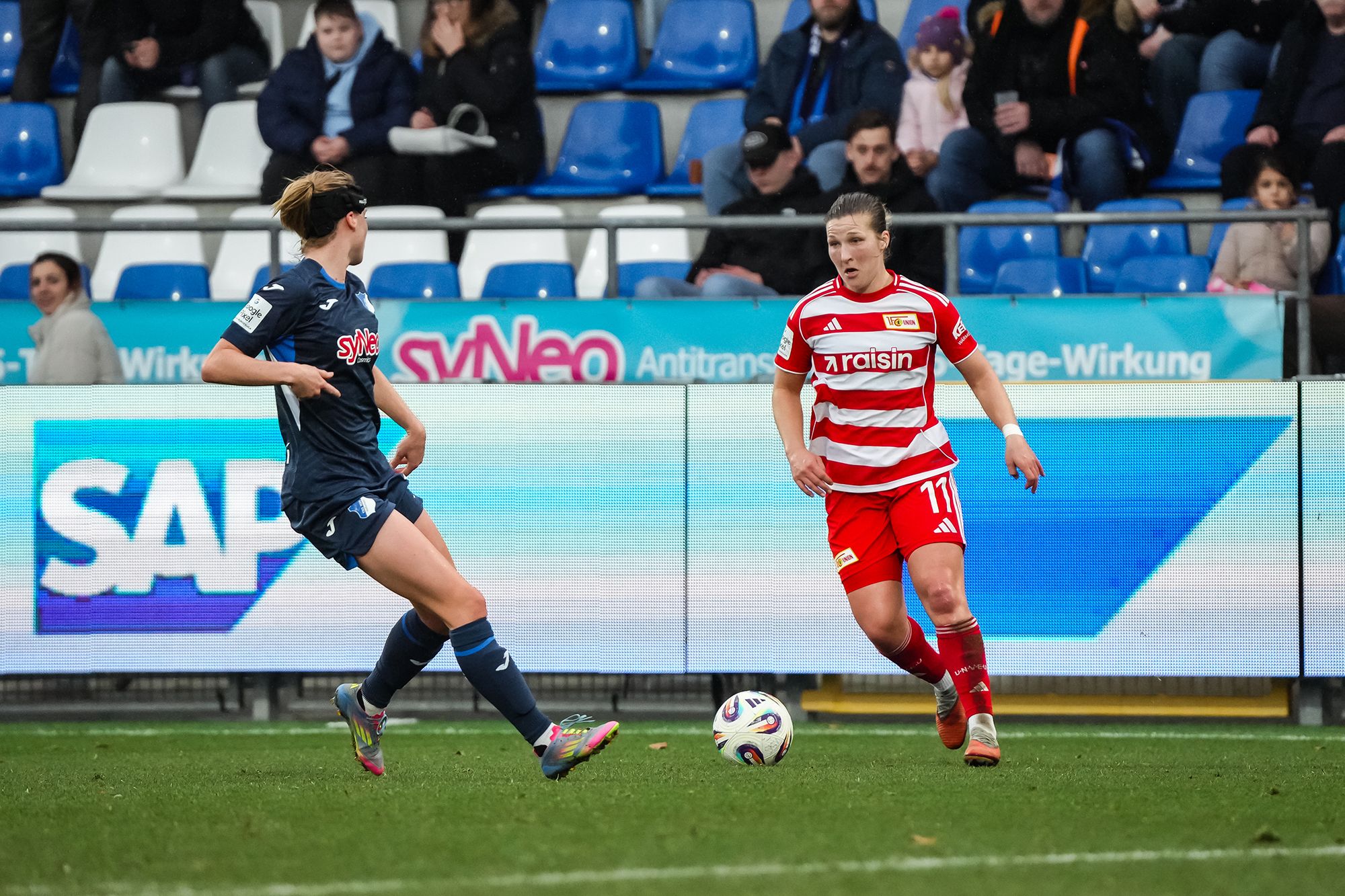 Die Eisernen starteten sehr gut in die Partie und erspielten sich in der Anfangsviertelstunde zahlreiche Torchancen. Der erste Abschluss des Spiels gehörte Lisa Heiseler, deren Versuch unter Bedrängnis über den Querbalken rauschte (4.). Drei Minuten später gab die Kapitänin auch den ersten Schuss aufs Tor ab: Ihren Abschluss aus 16 Metern fing TSG-Keeperin Laura Dick jedoch sicher ab. Wiederum nur eine Zeigerumdrehung später hatten die Eisernen die Großchance zum Führungstreffer: Dina Orschmann setzte sich stark im Strafraum durch und legte vor der Torhüterin für Antonia Halverkamps quer, die jedoch im letzten Moment noch abgegrätscht wurde, bevor sie den Ball ins leere Tor hätte schieben können (7.). Union hatte in dieser Phase Chancen im Minutentakt: Der nächste Abschluss gehörte Sophie Weidauer in der 9. Minute, doch Dick war erneut im Kasten zur Stelle. Auch einen Kopfball von Dina Orschmann in der 15. Minute lenkte die Schlussfrau mit den Fingerspitzen über die Latte.