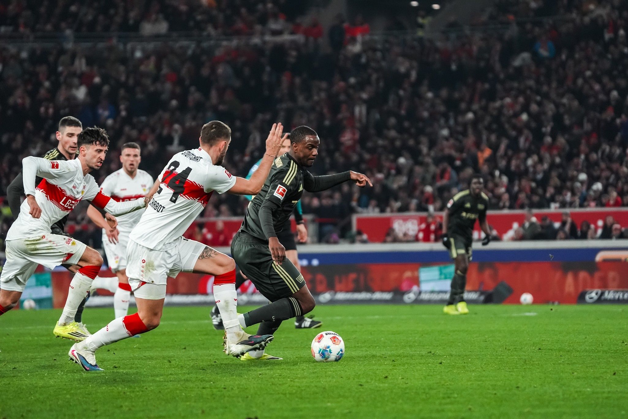 Ganz ungeachtet der Belastung der zurückliegenden englischen Woche zeigten beide Teams auch in den folgenden Minuten weiter hohe Laufbereitschaft, aggressives Pressing und viel vertikales Spiel nach vorne. Der nächste Höhepunkt in einer bis dato spannenden Partie kam von Stuttgarts Maximilian Mittelstädt, der das Tor aus zentralen 30 Metern aber um zwei Meter verpasste (26.). Ähnlich knapp verfehlte auch Startelf-Rückkehrer Josip Juranović die Führung mit seinem Abschluss aus der Distanz 120 Sekunden später.