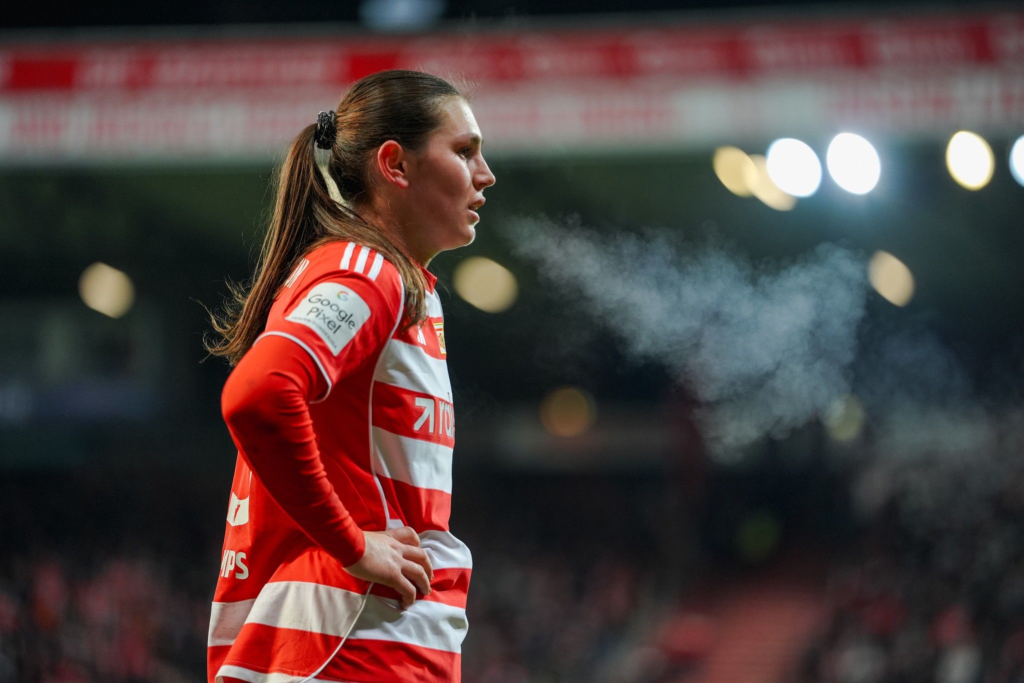 With 15 minutes gone, Victoria Schulz and Halverkamps hit the HSV byline together, the latter coming off worst, left in a heap and tended to as play went on without her. She returned a few minutes later, with neither side still having managed to break through; Halverkamps had run as far and battled as hard as anyone over the last difficult weeks. She wouldn’t go that easily into the night.