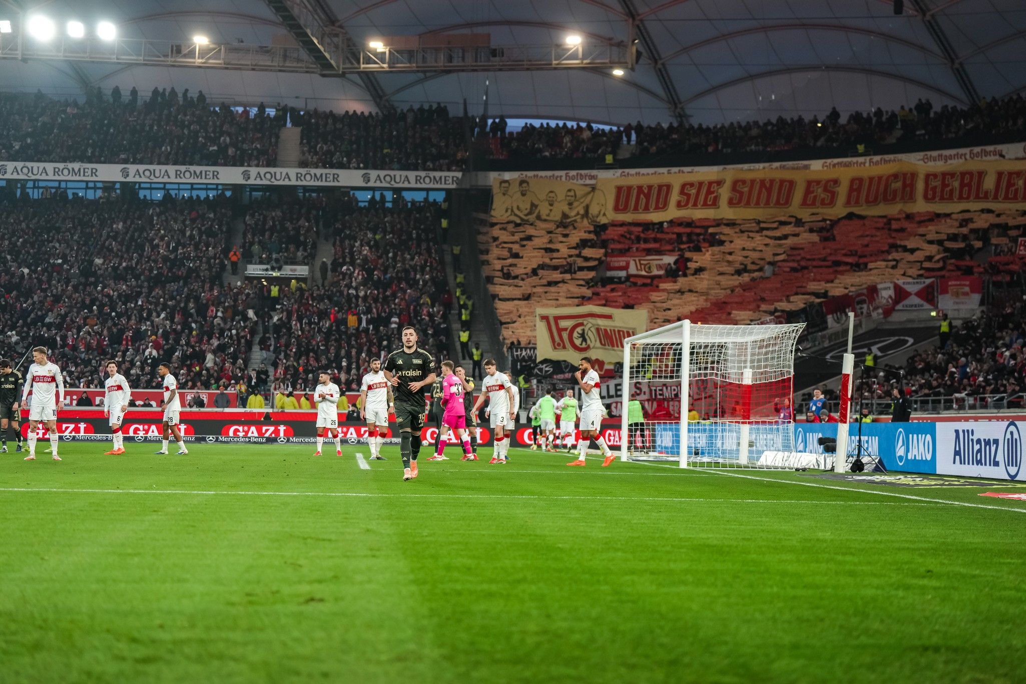Meanwhile a tifo had now spread the entirety of the Union section, taking up a corner of what was once called the Neckarstadion. At its heart was the first badge of the club – all in honour of their 60th birthday, to be celebrated on Tuesday.