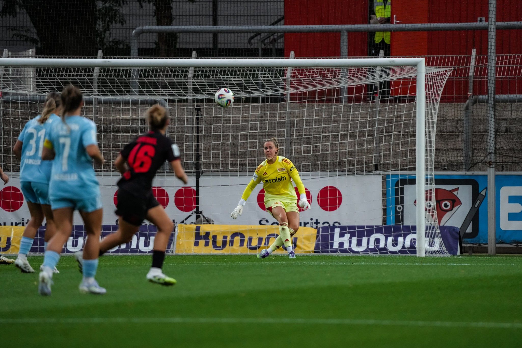 It was as if they were having to drag themselves into the fight. And as the half wore on, Union improved. Bösl took a cross high above her head on the fly. Dina Orschmann almost slipped Weidauer away up the middle, trying to thread a needle with the ball. After 25 minutes, Steuerwald read a clever pass through to Mädl perfectly, and closed off the sudden danger.