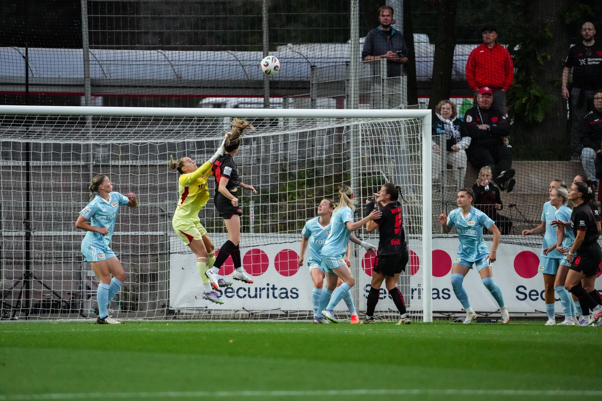 But Union wouldn’t heed their warning and a minute later Bayer threatened again, this time down the inside-left. If her last save had demonstrated the strongest of wrists and the sharpest of reflexes, this time Bösl would spill Vanessa Fudalla’s weaker shot from range, somehow turning away from the ball and letting it slip though her grasp. Bösl has Bundesliga experience. She admonished herself under her breath on the way up