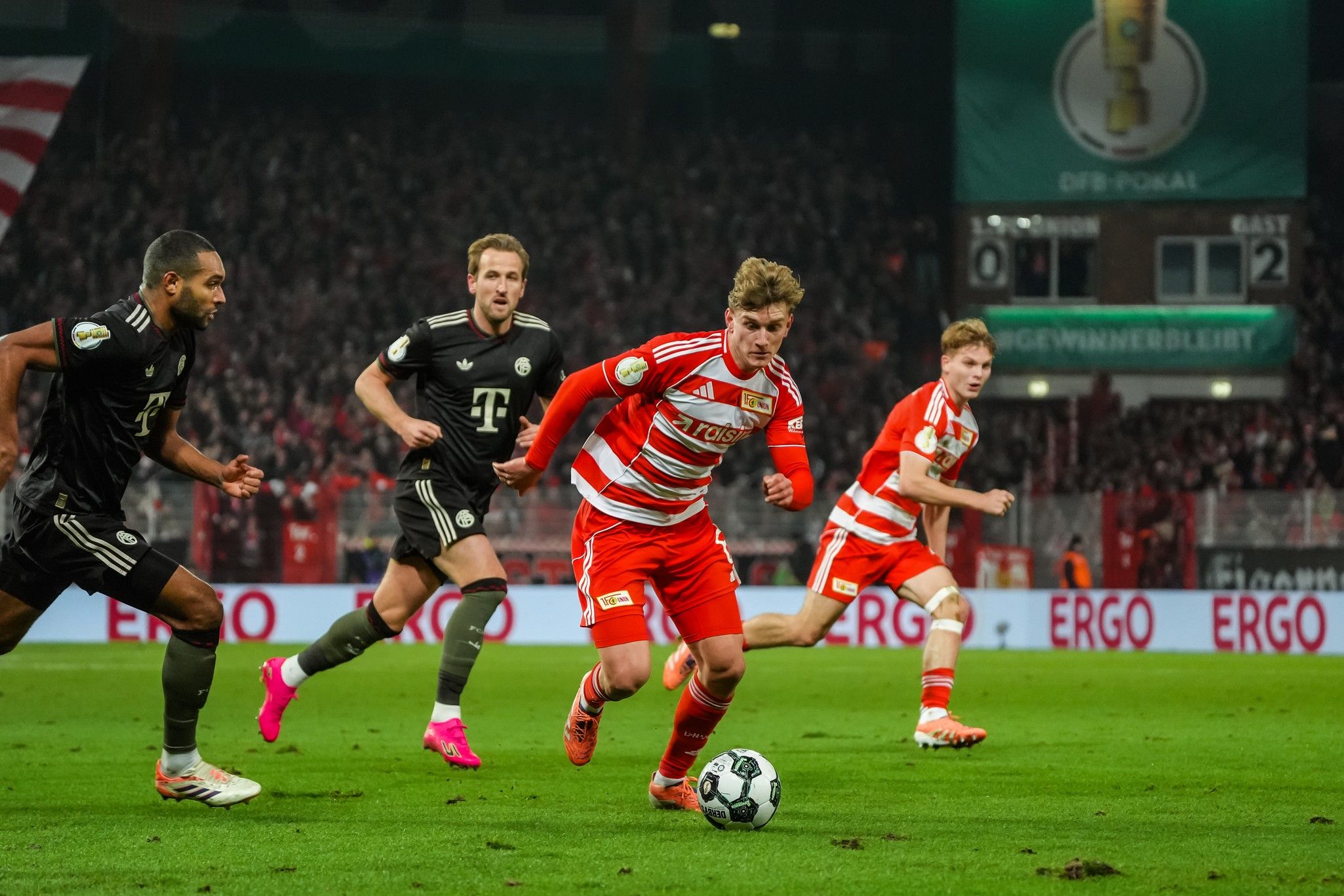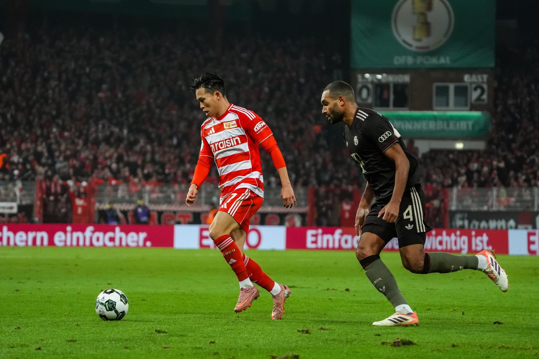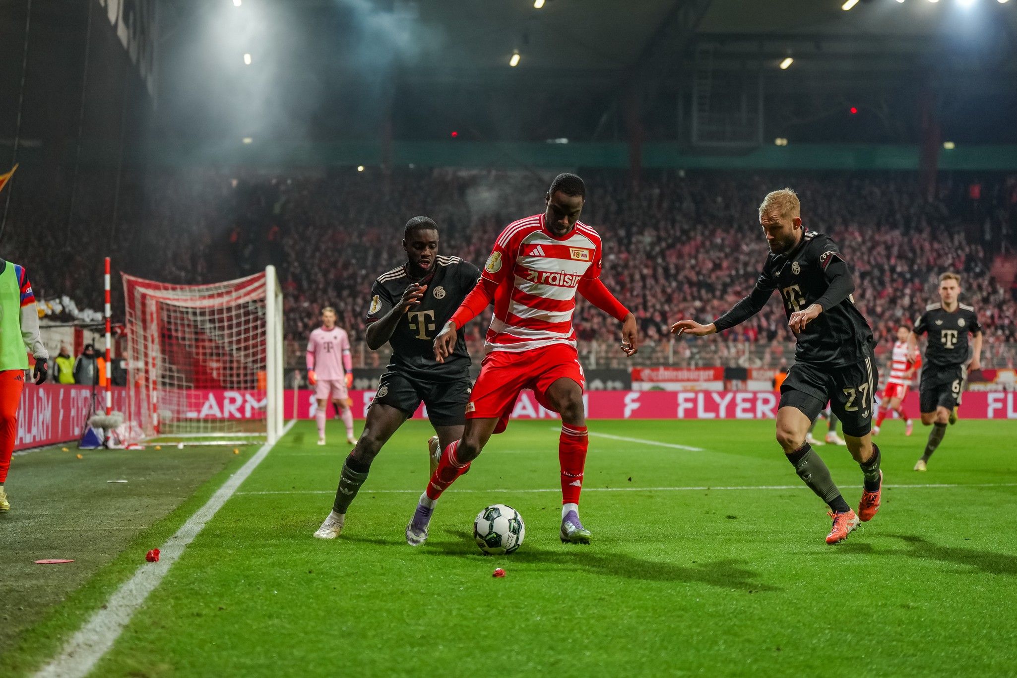 With the wall of noise, and a spectacular choreo – timed in three parts to perfection, red, yellow and white thirds of the Waldseite reflecting the F-C-U chant - now at their backs, Union countered; Khedira, Rothe and Ansah going toe-to-toe with Kimmich, Dayot Upamecano and Josip Stanisic near Bayern’s right-hand corner flag.