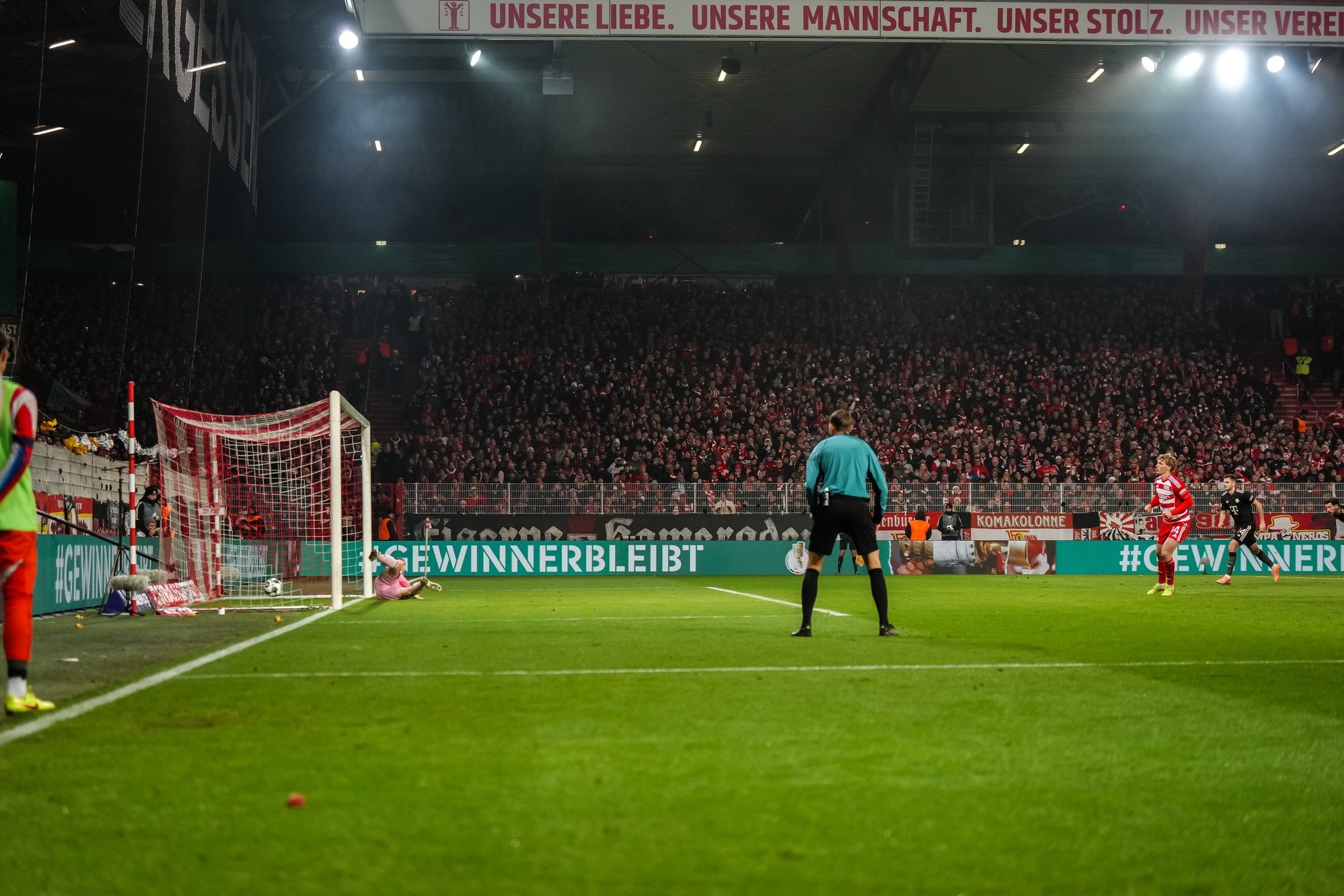 At kick off, the scene was set. Though the pitch bore the marks and ragged scars of the long season so far, the lights shone bright over Köpenick. It was a fitting occasion for midweek cup-tie. But still it started with a moment of solidarity; the silent protest that has accompanied every game across the land for the last weeks.