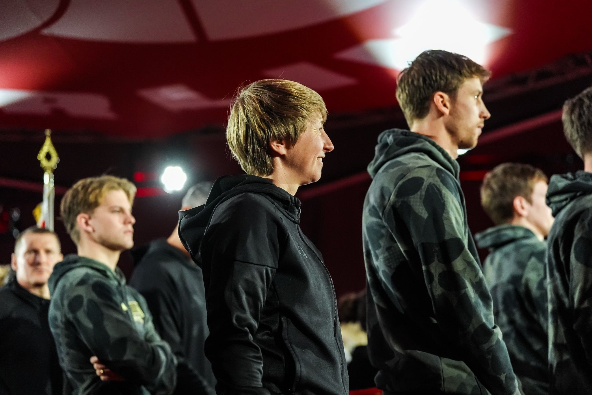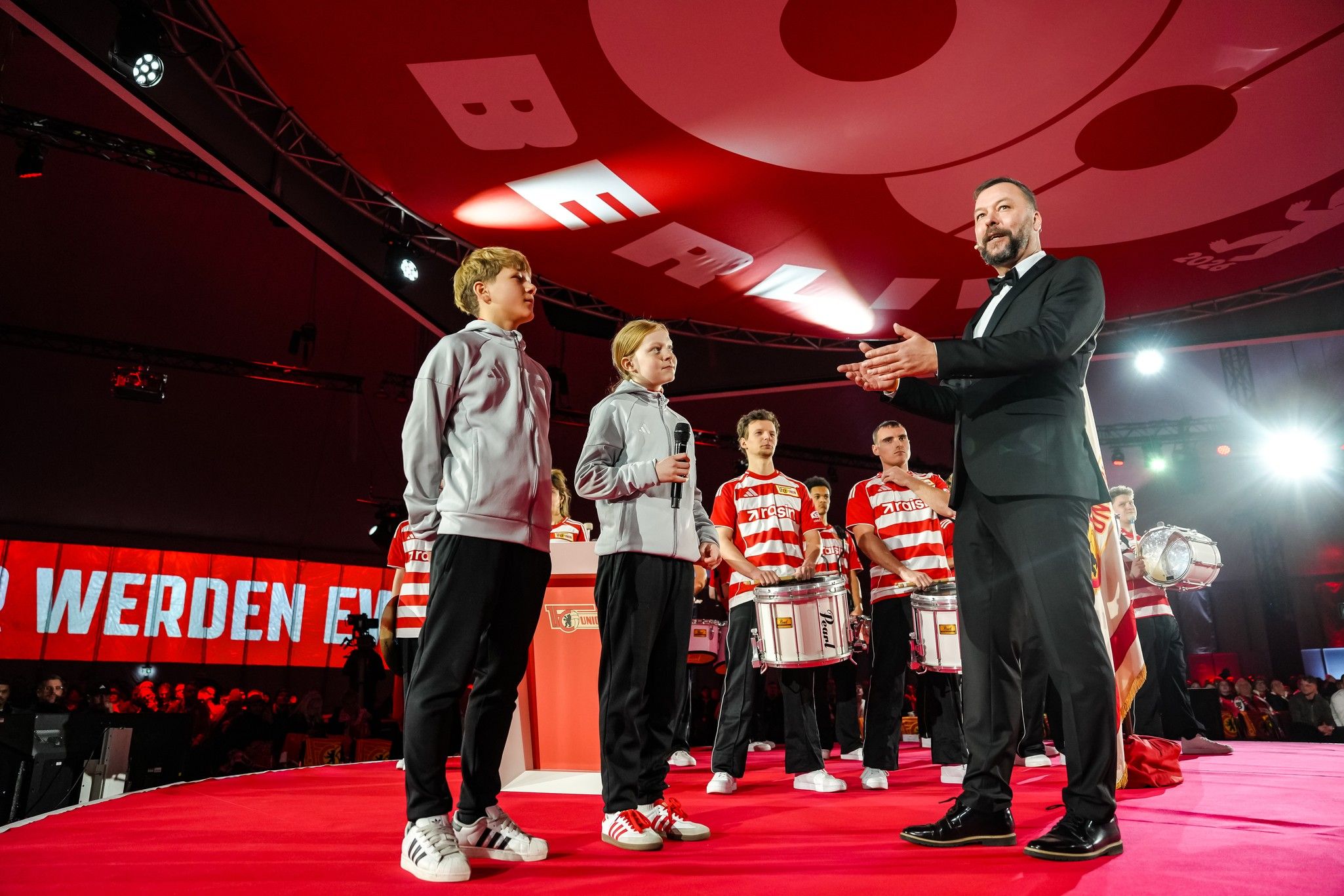 Amidst loud cheers, the players of the two professional teams then entered the central round stage via four catwalks. In short interviews, women’s and men’s head coaches Ailien Poese and Steffen Baumgart summarised the current sporting situation of their teams. Afterwards, both squads took their seats in the tent, accompanied by loud Union chants from the audience.